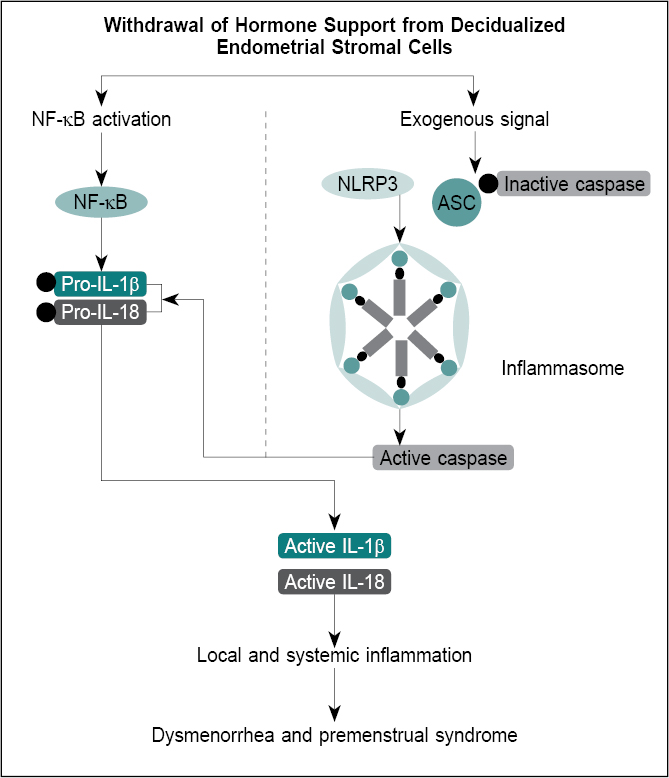It has been noted that NLRP3 inflammasome components immunolocalize to decidualized endometrial stromal cells immediately before menstruation. In vitro model of menstruation has also given evidence of the activation of NLRP3 inflammasome.4