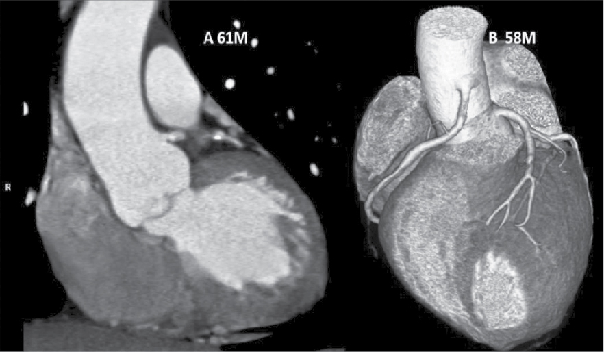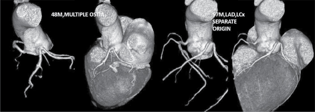 Figure 7. Two patients aged 48/M and 57/M, CT-CAG VRT images showing separate origin of LAD, LCx and there is no LMCA.