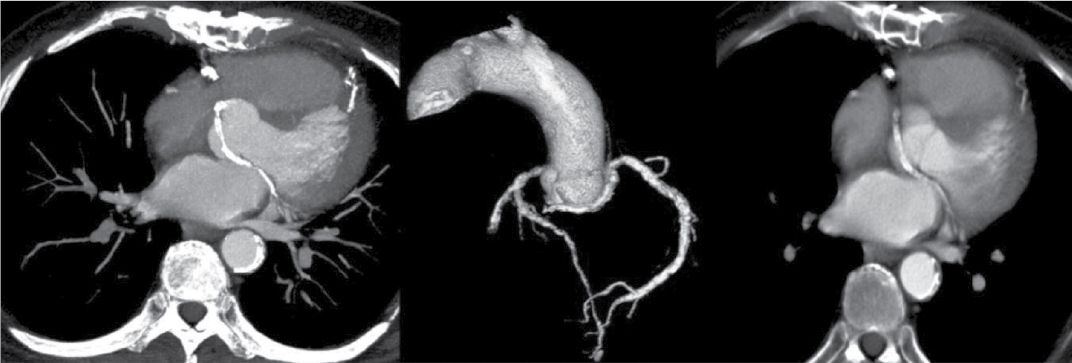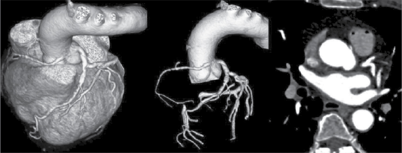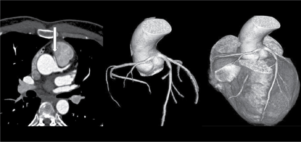 Figure 2. VRT and axial images of a patient (55/F) showing RCA originating from left coronary sinus of Valsalva. Course of RCA is interarterial.