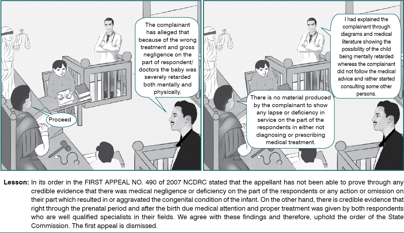 Appellant has not been able to prove through any credible evidence that there was medical negligence or deficiency on the part of the respondents or any action or omission on their part which resulted in or aggravated the congenital condition of the infant. On the other hand, there is credible evidence that right through the prenatal period and after the birth due medical attention and proper treatment was given by both Respondents who are well qualified specialists in their fields. Further, the certificate from AIIMS on which the appellant has relied was given some years later and only a question mark was put regarding the cause of the cerebral palsy being the prenatal viral fever from which the appellant’s wife suffered and it was not a definite opinion on the same.