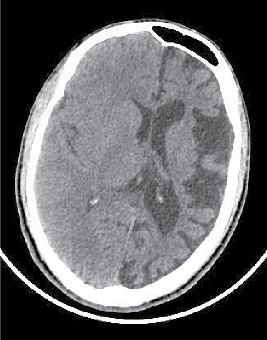 Figure 2. NCCT head showing left cerebral hemiatrophy as evidenced by reduction in volume, prominence of cerebral sulci and dilation of left lateral ventricle.