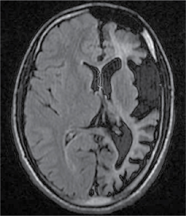 Figure 3. FLAIR transverse section showing loss of volume of white matter in left cerebral hemisphere with thinning of gyri and ex vacuo dilatation of left lateral ventricle.