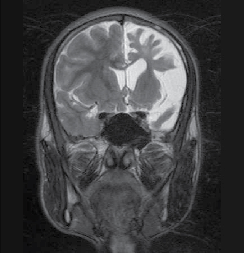 On examination, patient was conscious and oriented to time, place and person. There was extension at right elbow joint; pronated forearm and flexion at wrist joint (Fig. 1). Mental status examination revealed impaired calculation and Mini-Mental State Examination (MMSE) revealed a score of 24/30. On cranial nerve examination, patient had right upper motor neuron (UMN) type of facial nerve palsy. On motor examination, patient had gross wasting in right upper and lower limbs. Tone was markedly increased on right side of body with reduced power (3/5), brisk deep tendon reflexes and reduced sensation to touch, pain, temperature, vibration and proprioception. Plantar response was extensor on right side. Biochemistry was unremarkable. A provisional diagnosis of insidious onset gradually progressive sensorimotor hemiparesis with focal to generalized epilepsy with mental retardation was made. Noncontrast computed tomography (NCCT) head and magnetic resonance imaging (MRI) brain was performed, which revealed left cerebral hemiatrophy as evidenced by reduction in volume, prominence of cerebral sulci and dilation of left lateral ventricle. No other bony vault abnormality or prominence of frontal and mastoid air cells were seen (Figs. 2-4). Electroencephalogram (EEG) revealed epileptiform discharges in the form of sharp and slow wave complexes. Histopathology could not be done as attendants were not willing. Patient fulfilled the diagnostic criteria of RE (Table 1). He was treated with tablet phenytoin 100 mg TDS; tablet azathioprine 50 mg OD was started to halt progression of the disease. Patient had no episode of seizure thereafter. He was advised follow-up and repeat MRI brain was planned to check for any progression.