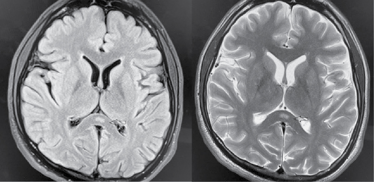 Figure 1. Focal areas of acute diffusion restriction signal intensity in the splenium in the midline portion (marked by arrow), appearing hyperintense on DWI image, findings consistent with acute ischemic infarct in splenium of corpus callosum.