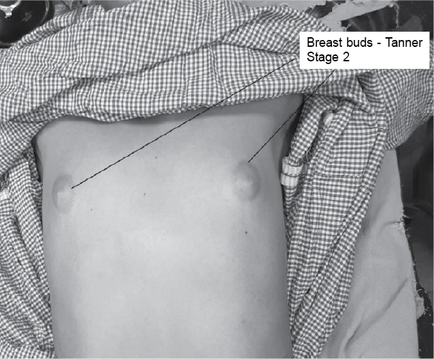 Suspecting Turner syndrome as the most likely cause of primary amenorrhea and absence of secondary sexual characters, we pursued our examination. On examination, patient had normal intelligence (she was a graduate). Her height and weight were 149 cm (4 feet 9 inch) and 36 kg, respectively. There was no low hairline, no low set ears, no webbed neck, no shielded chest, no cubitus valgus or genu valgum and no abnormality of nails or fingers. No abnormality was detected on thyroid gland palpation. The Tanner staging of breast was Stage 2 (breast buds present) (Fig. 1), while that for pubic hair was Stage 1 (sparse pubic hairs were present). Axillary hair were scanty. On auscultation, first and second heart sounds were normally heard and no murmur was audible. Abdomen on palpation was nontender and on local examination, urethral and vaginal openings were present. Labia majora and minora were not well developed. Based on the examination, a provisional diagnosis of primary amenorrhea was made and further investigation and examination under anesthesia were planned.