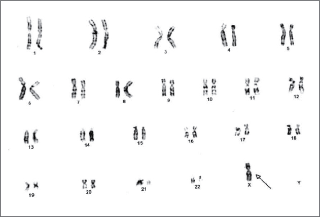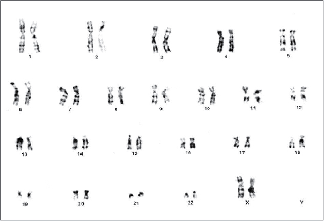 - She was subjected to karyotyping which revealed two cell lines, that is, first cell line (25 cells examined) showed 45,XO (Fig. 2) while the second cell line (5 cells examined) showed 46,XX (Fig. 3).