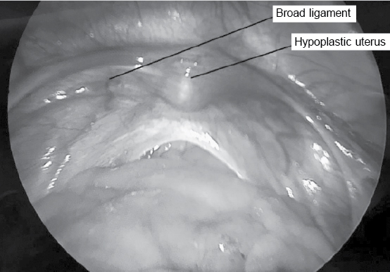 Uterine sound went inside the cervix up to 3 cm. Laparoscopy performed revealed small 3 × 2 cm sized mass at the site of uterus which was suspected to be the uterine body (Fig. 5). Uterosacral ligaments were appreciated. Fallopian tubes and ovaries could not be appreciated.