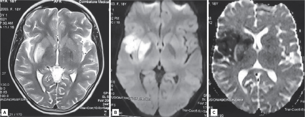 Figure 1. MRI of brain – A) T2/FLAIR; B) Diffusion-weighted imaging showing hyperintensity in right insular cortex and right lentiform nucleus; C) Attenuated diffusion coefficient showing hypodensity in the right gangliocapsular area, right insular cortex and caudate.