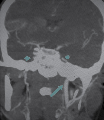 Figure 3. CT angiography of brain – Nonvisualization of infraclinoid part of right internal carotid artery, nonvisualization of right common carotid artery.