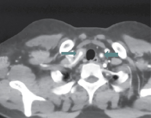 Figure 4. CT angiogram of chest blood vessels – mural thickening seen in both the subclavian arteries.