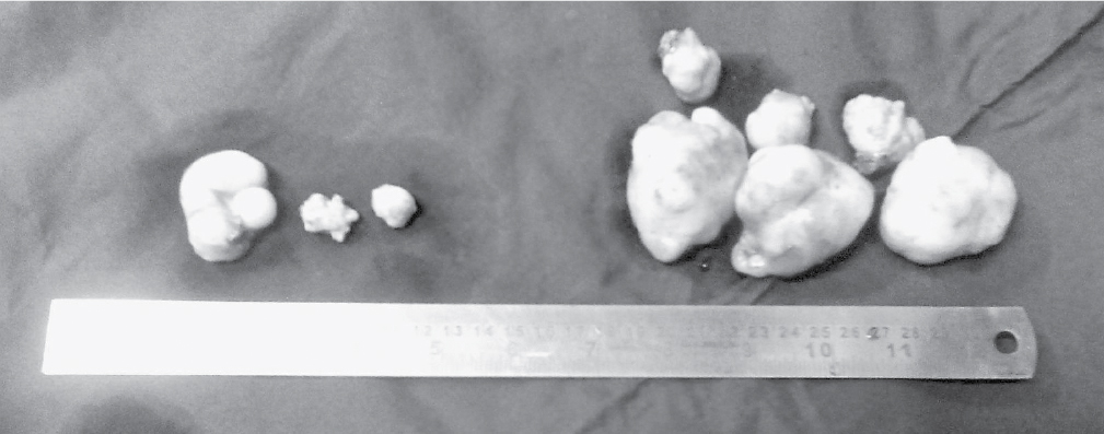 The patient’s mother had died of breast cancer at less than 50 years of age, and her maternal grandfather had carcinoma cheek, although he had died of some other cause. Six lumps from the left breast and 3 from the right breast were removed (Fig. 1) and sent for histopathological examination. All were reported to be benign fibroadenomas. The girl refused for BRCA gene mutation assessment, but agreed for a follow-up in case of recurrence.