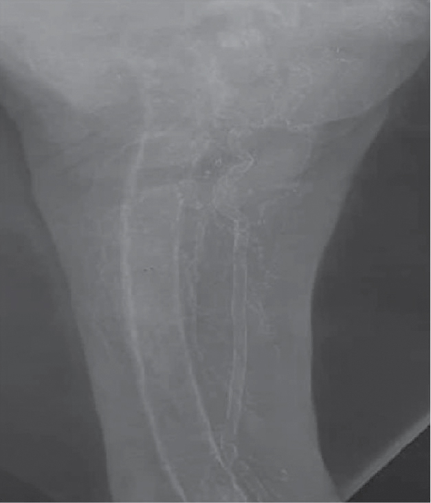 Figure 1. X-ray thigh of a patient of CKD Stage 5D on maintenance hemodialysis with CKD-metabolic bone disease showing pipe stem (tram line) appearance suggestive of medial calcification of femoral artery.