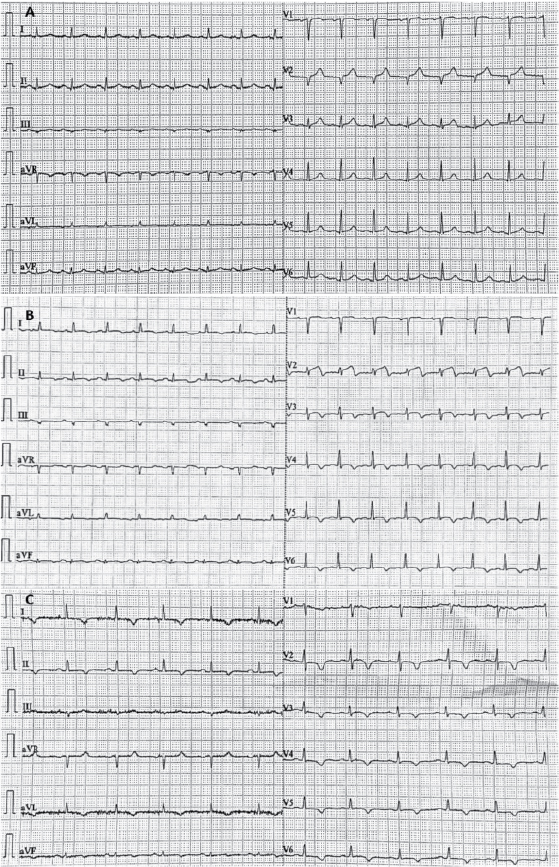 Figure 1. Serial ECGs demonstrating dynamic ST-T changes from before event (A); during event (B) and in 4 weeks follow-up period (C).