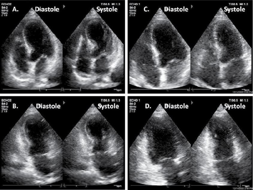 Figure 2. Echocardiogram in apical 4 chamber and apical 2 chamber views during acute event (A & B) showing apical akinesis and basal hyperkinesis leading to characteristic appearance of apical ballooning or Japanese Takotsubo (octopus pot) in systolic frame. Follow-up echocardiogram in same views after 4 weeks of follow-up (C & D) showing normalization of wall motion abnormalities.
