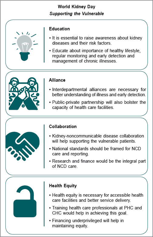 Interdepartmental alliances are necessary for better understanding of illness and early detection of kidney disease. Public-private partnership (PPP) will also bolster the capacity of health care facilities and help in the early diagnosis and prompt treatment of such illnesses. Kidney-noncommunicable disease (NCD) collaboration will help support the vulnerable patients. National standards should be framed for NCD care and reporting. Also, research and finance would be the integral part of NCD care.