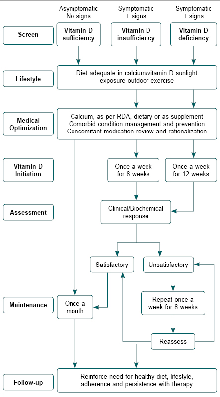 Considering vitamin D prevalence in the general population and its clinical manifestations, we recommend the following dosage and duration of vitamin D: (a) Asymptomatic individuals – 800 to 2,000 IU, once every 30 days. (b) Symptomatic vitamin D insufficient – Up to 6,000 IU - initiation dose is once a week for 8 weeks and maintenance dose up to 60,000 IU, once a month. (c) Symptomatic vitamin D deficient – Up to 6,000 IU - initiation dose is once a week for 12 weeks and maintenance dose up to 60, 000 IU, once a month.