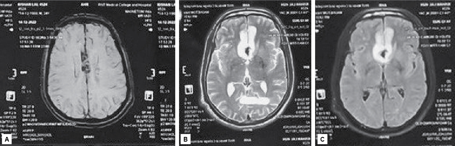 Figure 1. SWI Image shows blooming along parafalcine location (A). T2W (B) and FLAIR (C) images show hyperintensity involving cortical as well as subcortical white matter in bilateral parafalcine frontal location.