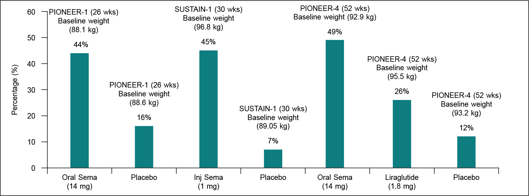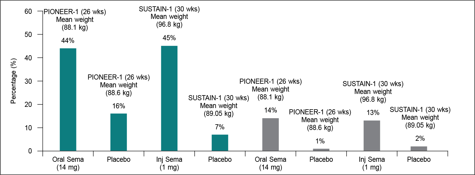 Figure 1. Comparative weight loss (≥5%) with oral (14 mg) and injectable semaglutide (1 mg) vs. placebo.