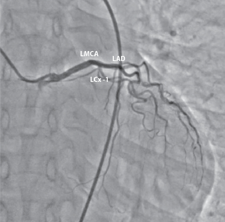 Figure 1. Left coronary angiogram showing small, left circumflex artery (LCx-1) arising from left main coronary artery (LMCA).