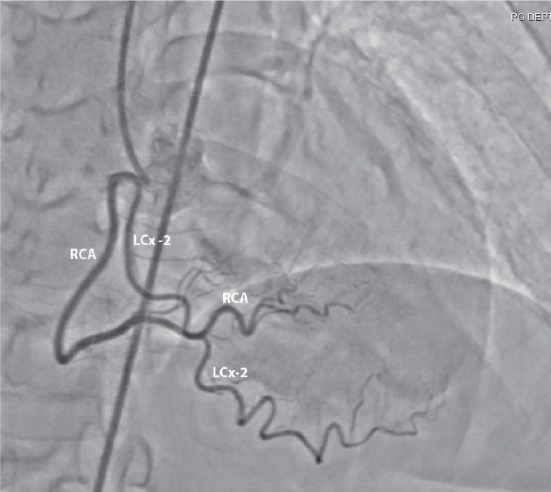 Figure 2. Right coronary angiogram showing second left circumflex artery (LCx-2) arising from right coronary artery (RCA).