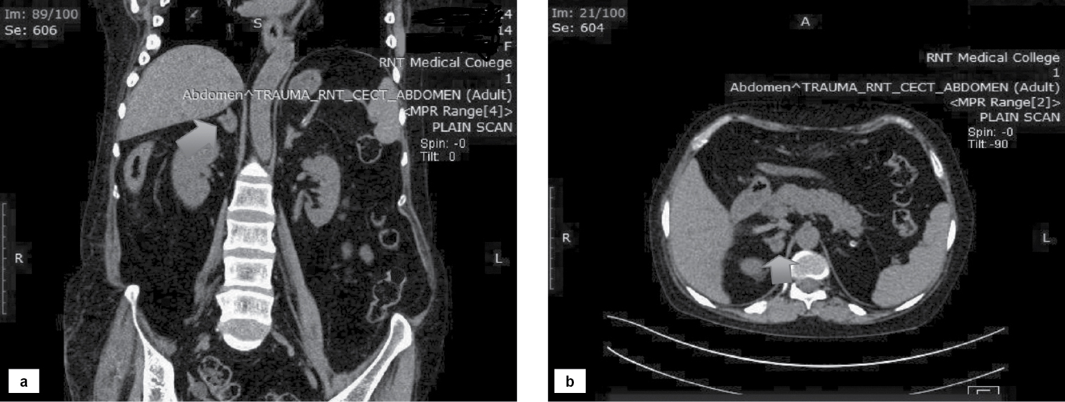 Figure 3. Coronal (a) and transverse (b) sections showing soft tissue density lesion in the medial limb of the right adrenal gland.