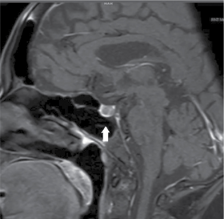Magnetic resonance imaging (MRI) scan of the pituitary gland with contrast showed a hypointense lesion of size measuring approximately 6 ´ 5 mm is seen involving the right side of the pituitary gland. There is no extension above sella turcica suggestive of pituitary microadenoma (Fig. 4).