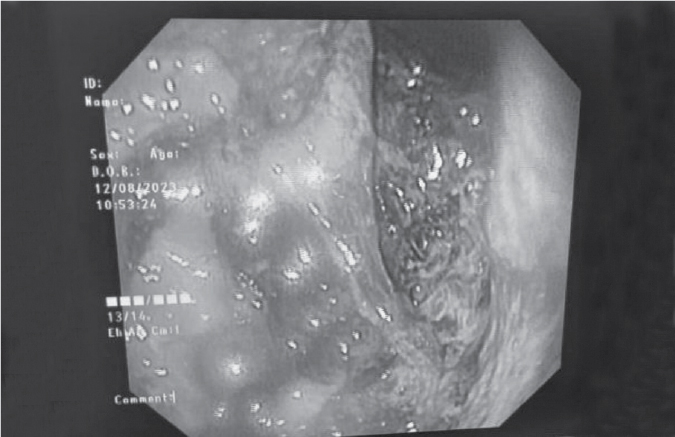 He underwent videobronchoscopy and bronchoalveolar lavage (BAL) was taken from the left lower lobe superior segment. Cartridge-based nucleic acid amplification test (CB-NAAT) done on BAL revealed high levels of M. tuberculosis with no rifampicin resistance. BAL Gram stain and ZN stain were negative.