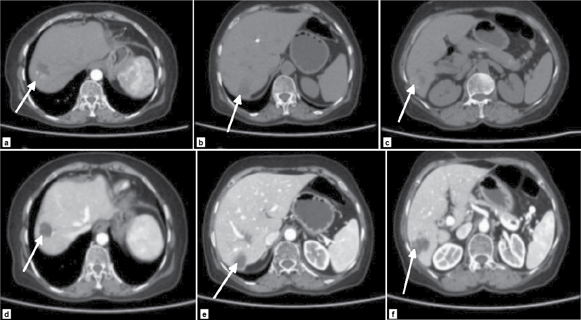 Figure 1 (a-f). CT images of liver showing multiple peripherally enhancing lobulated lesions in the right lobe of liver. Few lesions in the subcapsular region can be seen.
