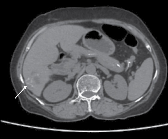 A 72-year-old female presented with chief complaints of intermittent fever and generalized weakness for 2 years. She had a history of open drainage, debridement and peritoneal lavage for a liver abscess (involving the 7th segment) 2 years back. She also had right-sided abdominal pain and loss of appetite since then. She denied any history of abdominal distension, jaundice, loss of weight or bowel and bladder disturbances.