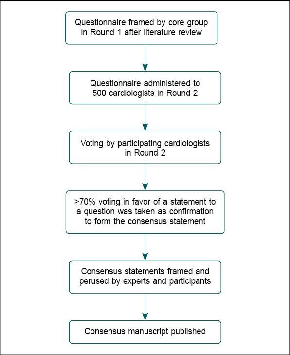 In the first round, the questionnaire was framed by the core group after a literature review. The literature review was done using PubMed database. In Round 2, the questionnaire was administered to 500 cardiologists across India. Voting for answers to the questions was conducted and >70% of votes in favor of the answer were taken as a positive point to frame the consensus statement.