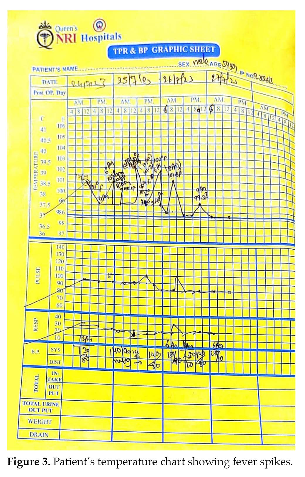 history of diabetes treated with a combination of insulin aspart and insulin aspart protamine and had taken an antibiotic (amoxicillin clavulanate) initially but discontinued it due to gastrointestinal side effects. He had taken cefuroxime for 3 days before admission. The patient was febrile with a temperature of 103°F (Fig. 3), normal blood pressure and a pulse rate of 101/min. Physical examination revealed clear lungs, tachycardia, mild abdominal distension with no tenderness and restlessness. Laboratory investigations are detailed in Table 1.