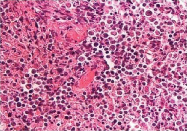 Ultrasonography (USG) of abdomen did not show any lymphadenopathy. USG left cervical region showed few enlarged level V cervical lymph nodes. Patient underwent cervical lymph node biopsy, which revealed histiocytic necrotizing lymphadenitis suggestive of KFD (Figs. 1 and 2).