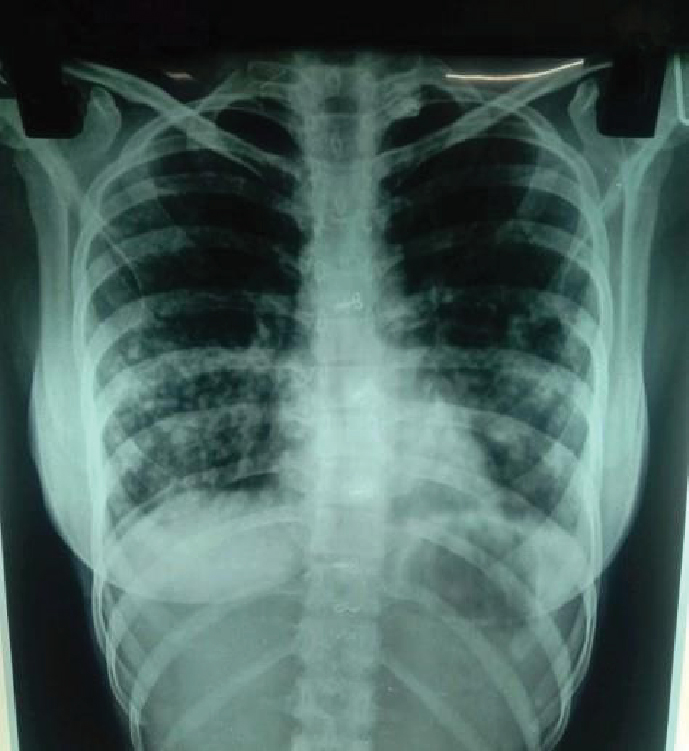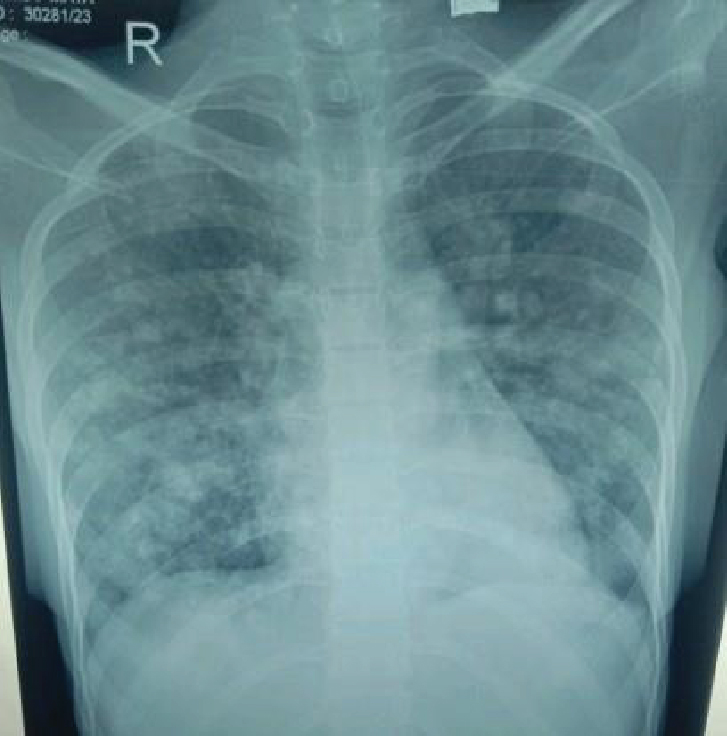 Figure 1. Chest X-ray (PA) - showing bilateral heterogeneous opacities in lower zones.