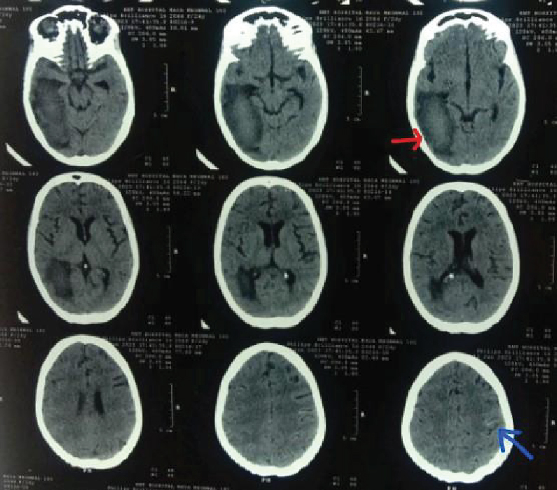 Figure 3. NCCT head showing mild linear hyperdensity in left parietal region (blue arrow). Old ICH changes are also seen (red arrow).