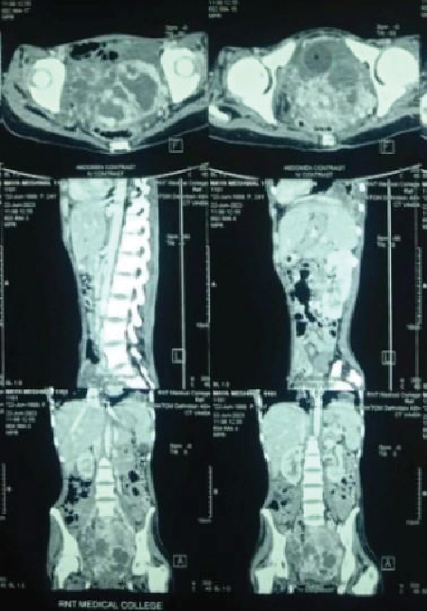 Figure 6. CECT abdomen and pelvis showing heterogeneously enhancing soft tissue density mass in pelvic cavity with nonseparate visualization of bilateral adnexa.