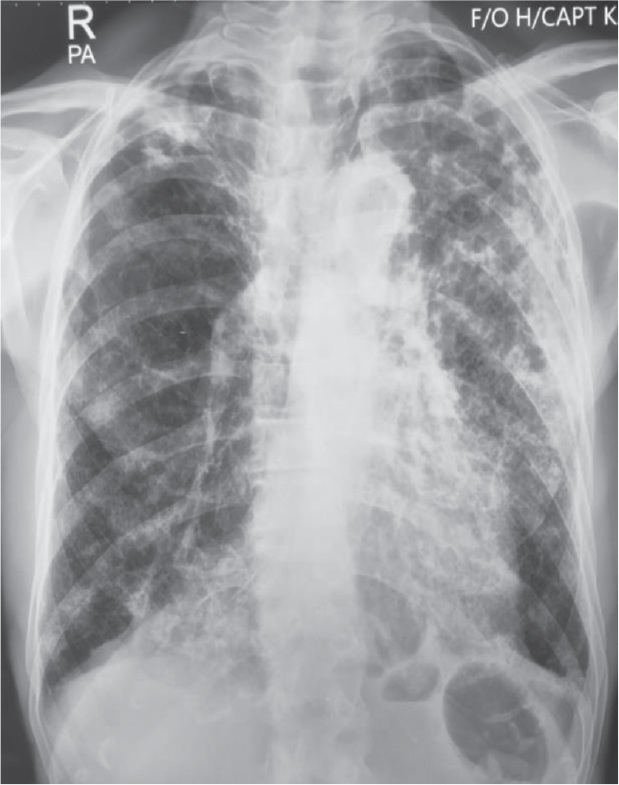 Figure 1. Chest radiography (PA view) demonstrating a hyperinflated lung field with reticular opacities in the right upper zone, left upper and middle zone. Left upper and middle zone shows rib crowding along with nonhomogenous air space opacities.