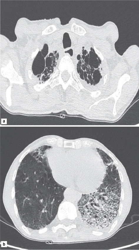 Figure 2. HRCT of the chest demonstrating (a) bilateral apical emphysematous changes (b) interlobular septal thickening in the left lingula and left lower lobe with consolidation in the left lower lobe.
