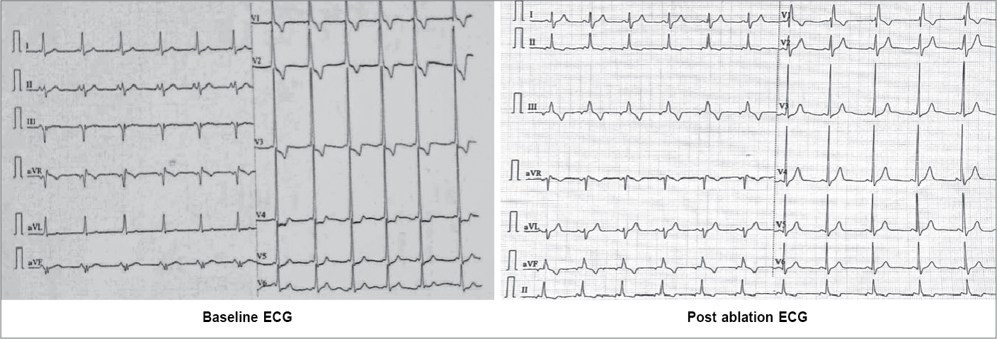 After written informed consent, patient was taken for electrophysiological study. Two quadripolar diagnostic catheters were advanced under fluoroscopy to His bundle region and right ventricular apex. One decapolar catheter was advanced into the coronary sinus. During the electrophysiological study at baseline, atrial-His bundle (AH) and His-ventricular (HV) intervals were 85 ms and 3 ms in sinus rhythm, respectively. There were no atrioventricular (AV) conduction abnormalities. A narrow complex tachycardia (tachycardia cycle length [TCL] = 400 ms) was easily induced during catheter placement with following features: initiation of the tachycardia with a critical AH interval, fixed 1:1 ventriculoatrial (VA) conduction, concentric retrograde activation with VA interval of 37 ms, a post-pacing interval (PPI, 576 ms)–TCL (406 ms) >115 (170 ms) and ventricular overdrive pacing resulted in a VAHV response. His synchronized and early premature ventricular contraction (PVC) did not reset the tachycardia. His synchronized premature atrial contraction (PAC) also failed to reset the tachycardia. The tachycardia was reproducible and consistent (Fig. 2). After confirming the diagnosis of typical AV nodal re-entrant tachycardia (AVNRT) a decision was taken for slow pathway ablation. Using a steerable ablation catheter, with the help of intracardiac electrograms (EGMs) and using fluoroscopy, the region of the slow pathway was identified. Radiofrequency applications were made in the region of the slow pathway while constantly monitoring temperature, impedance, ECG and intracardiac EGMs, monitoring for fast junctional conduction and radiofrequency energy was halted if there was evidence of VA block. Radiofrequency ablation resulted in a junctional rhythm with intact AV conduction, which is a typical response. The AV nodal slow pathway was successfully modified (Fig. 3).
