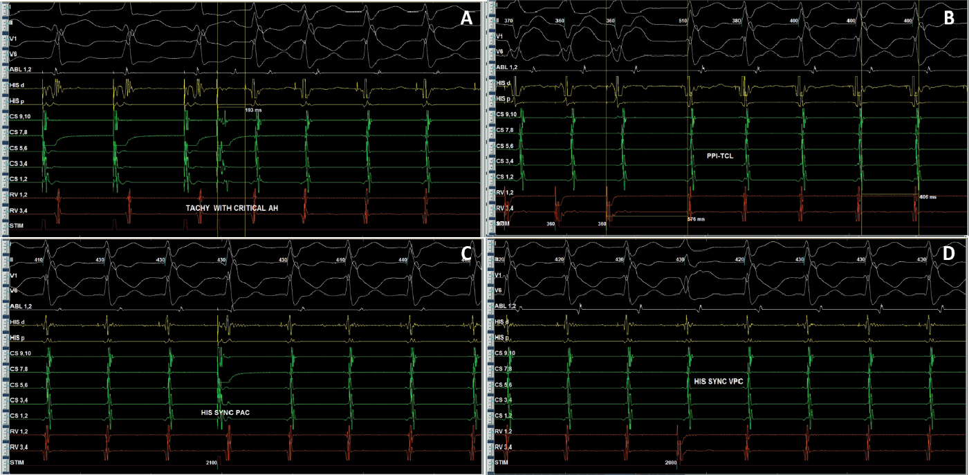 Figure 2. Intracardiac EGMs showing tachycardia induction with AH jump (A), RV overdrive pacing (B), and response of His synchronous PVCs (C) and PACs (D) diagnostic of typical slow-fast AVNRT.