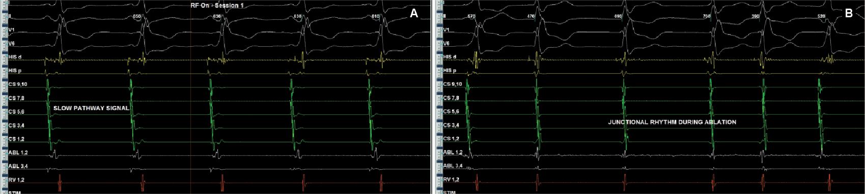 Figure 3. Slow pathway signals (A) at rightward inferior extension showed fused signals because of underlying pathway. Junctional rhythm (B) in response of radiofrequency energy.