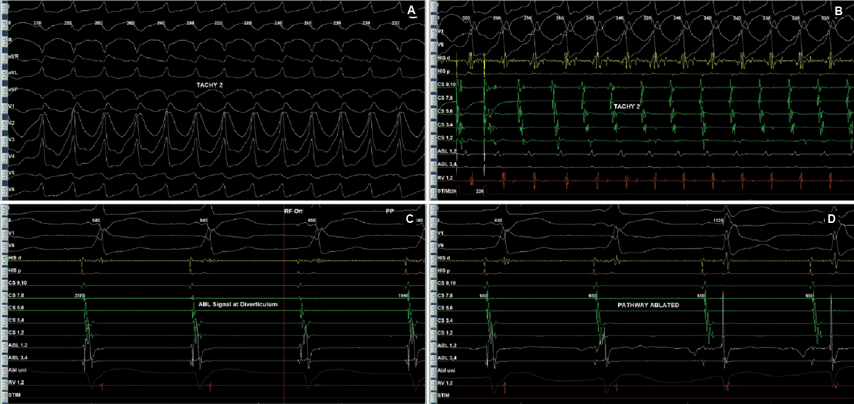 Figure 4. Antidromic tachycardia (A and B) involving posteroseptal pathway. EGMs recorded (C) inside diverticulum neck that was ablated successfully (D).