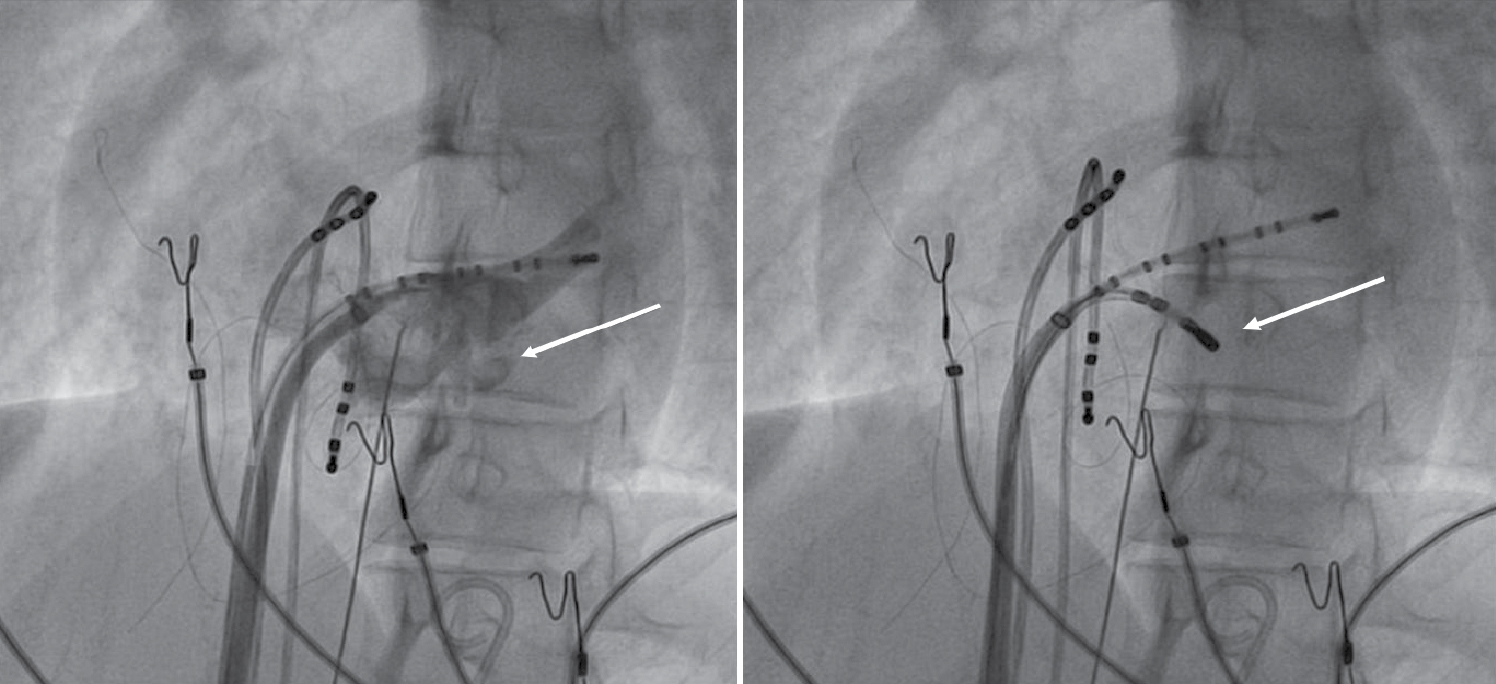 Figure 5. Coronary sinus angiogram (left) showing coronary sinus diverticulum and site of successful ablation (right).
