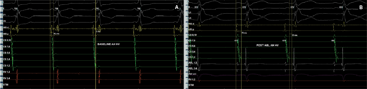 Figure 6. Intracardiac intervals baseline (A) showed HV interval of 3 ms that was normalized (B) after successful accessory pathway ablation.