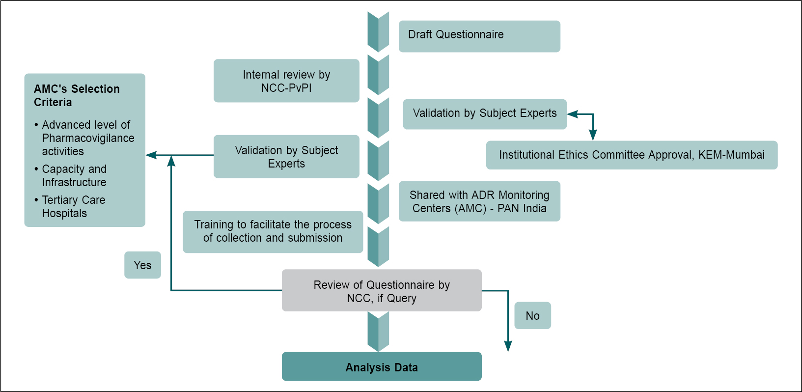 At the time of the questionnaire circulation, NCC-PvPI had a strong network of 534 AMCs for reporting of adverse drug reactions/adverse events. Of these, 134 AMCs were selected by applying the criteria such as, quality of the specialized care services, quantity and frequency of ADR Reporting and Pharmacovigilance Capacity at the Centre (Fig. 2).
