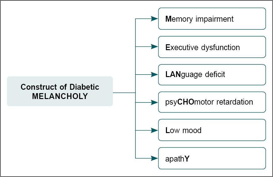 Patients living with diabetes suffer from a spectrum of cognitive and mood disorders. To encompass the diverse neuropsychological aspects of diabetes, the authors herein propose the new construct of “diabetic melancholy”, which stands for memory impairments, executive dysfunctions, language impairments, psychomotor retardation, low mood, and apathy. Authors have also described the underlying neural basis of cognitive dysfunction in diabetes.