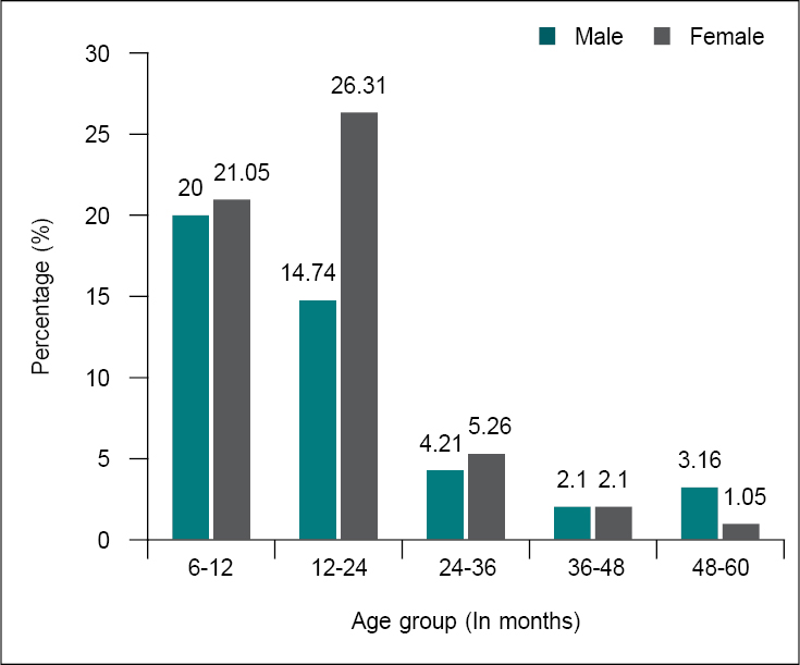 a total of 95 SAM patients were included with mean age 19.74 months and an F:M