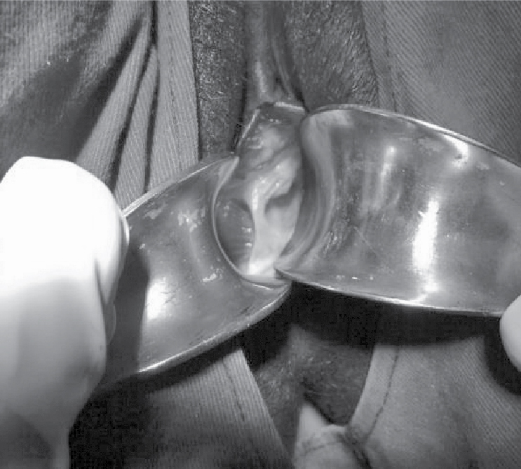 Figure 1. Per speculum examination showing right and left hemivagina with complete vertical vaginal septum.
