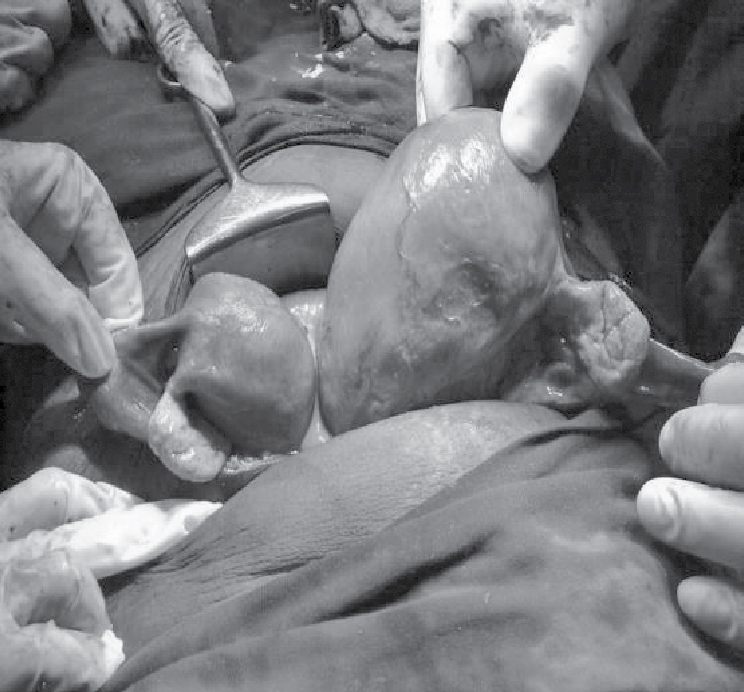 Figure 2. Anterior view of gravid right hemi-uterus with incision on the lower segment and