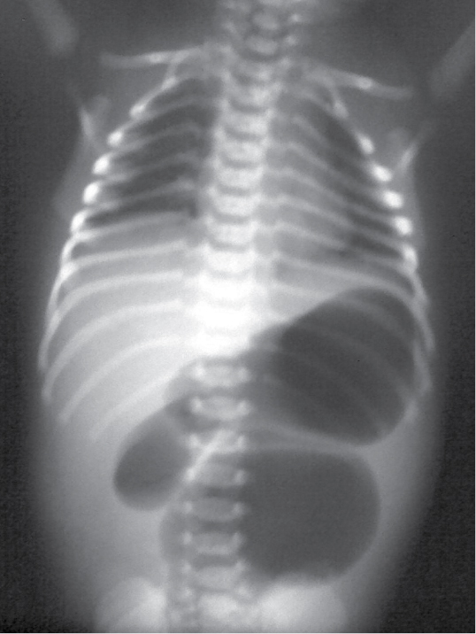 normal. Abdominal X-ray revealed three prominent gas shadows in upper abdomen with gasless distal abdomen.