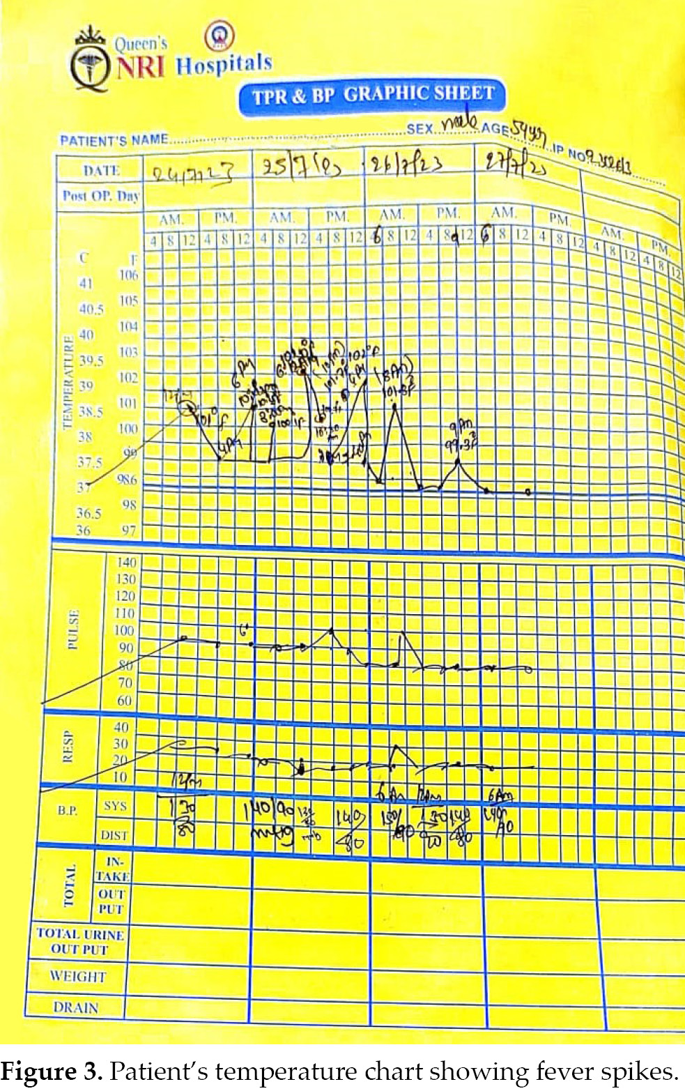 admission. The patient was febrile with a temperature of 103°F (Fig. 3),